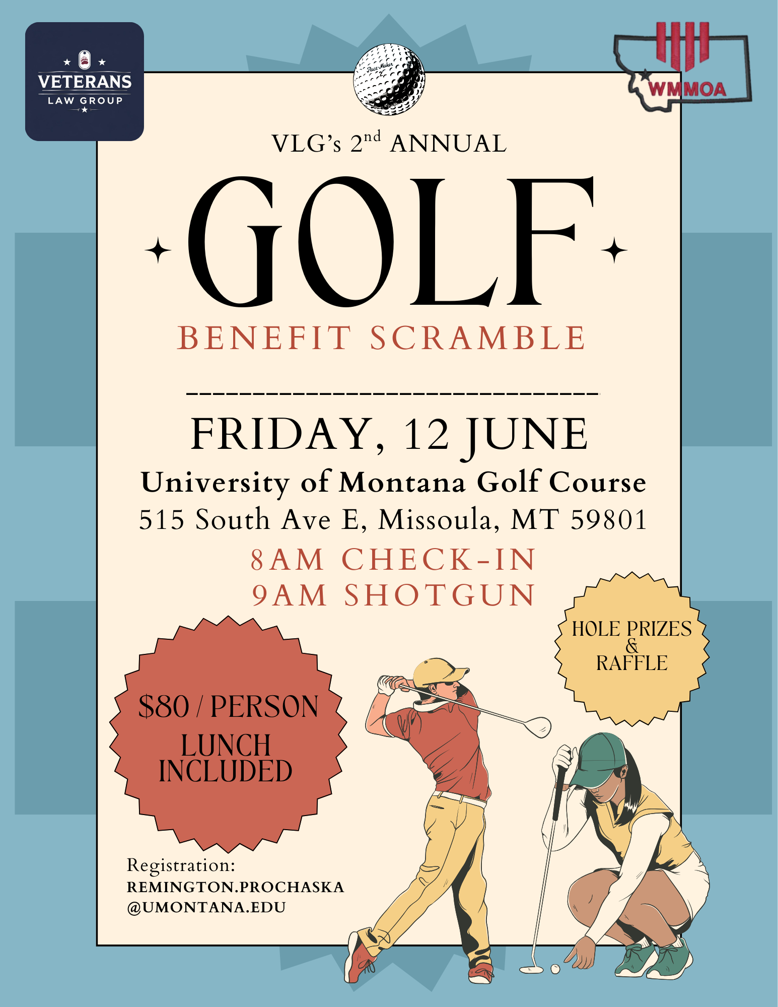 June 12th ~ Veterans Law Group (VLG) 2nd Annual Golf Benefit Scramble, UM Golf Course, 8am check in (FLYER). Questions: Remington - President of the Veterans Law Group & UM Student Veteran Organization, remington.prochaska@umconnect.umt.edu or connect on LinkedIn.